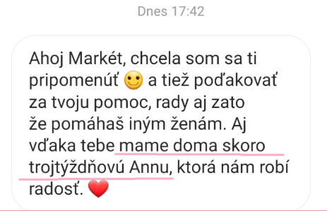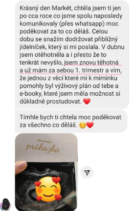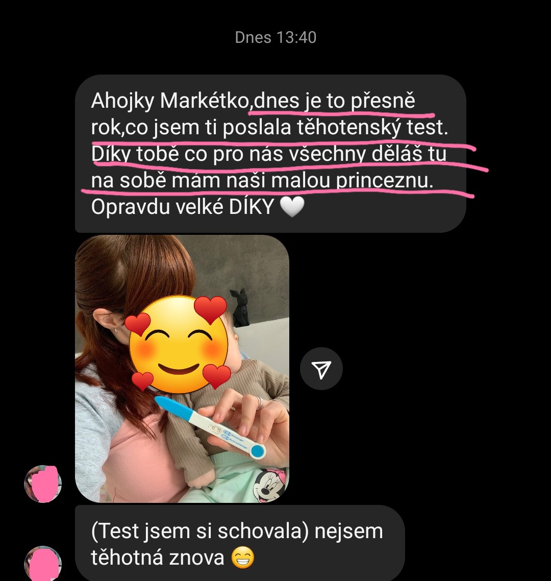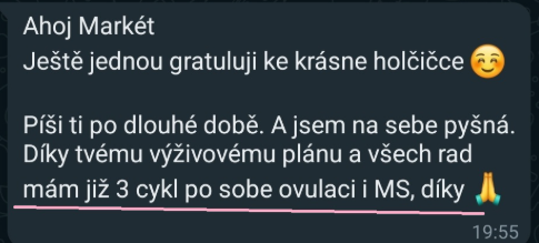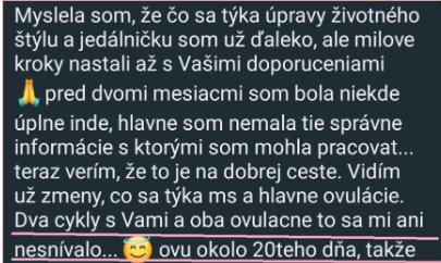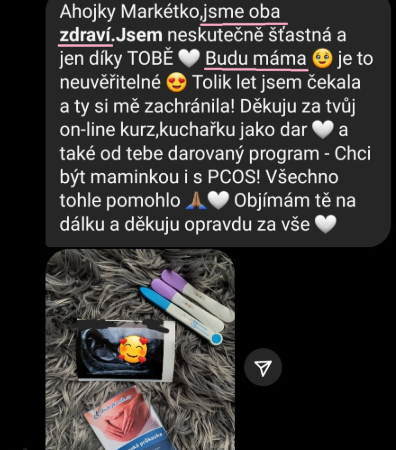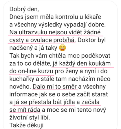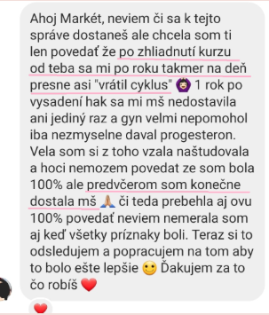 "Po zhlédnutí kurzu od tebe se mi po roce téměř na den vrátil cyklus. 1 rok od vysazení hormonální antikoncepce se mi menstruace nedostavila ani jedenkrát a lékař mi moc nepomohl, jen dával progesteron."