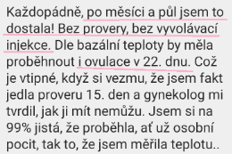 "Po měsíci a půl jsem to dostala! Bez vyvolávací injekce, dle bazální teploty by měla proběhnout i ovulace v 22. dnu. Gynekolog mi tvrdil, jak ji mít nemůžu"